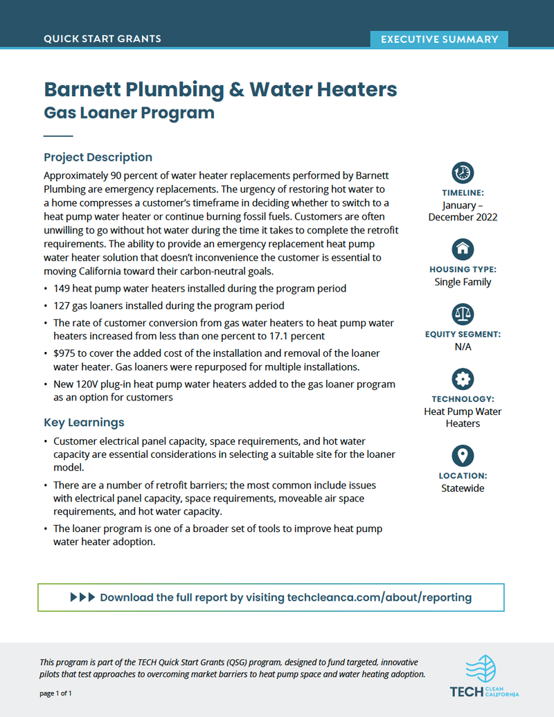 Barnett Plumbing will test whether providing temporary gas water heaters to customers who need an emergency water heater replacement—to provide water heating while home upgrades required to support a heat pump system are made—will enable more households to fuel-switch.